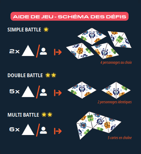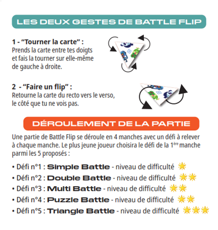 Battle flip Commander Présentation Règles du jeu 1 à 5 Joueurs, Durée 10′, Age 6+Combinez au plus vite 2 cartes triangle pour former un personnage.36 possibiltés et toujours 1 solution3 thèmes (Monstres, Animaux et Espace)5 manières de jouer Revenir à la navigation principale